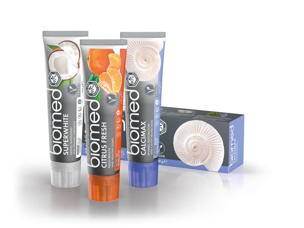 - Biomed Calcimax: - Aqua, Hydrogenated Starch Hydrolysate, Dicalcium Phosphate Dihydrate, Hydrated Silica, Glycerin, Sodium Coco-Sulfate, Cellulose Gum, Sodium Chloride, Aroma, Zinc Citrate, Sodium Bicarbonate, Benzyl Alcohol, Tetrasodium Glutamate Diacetate, Kaolin, Xanthan Gum, Menthol, Hydroxyapatite, Arginine, Laminaria Digitata Extract, Fucus Vesiculosus Extract, Spirulina Maxima Extract, Menthyl Lactate, Betula Alba Leaf Extract, Plantago Major Leaf Extract, Thymus Serpillum Oil, Stevia Rebaudiana Leaf Extract, Sodium Hydroxide, Sodium Benzoate, Potassium Sorbate, Geraniol, Linalool.