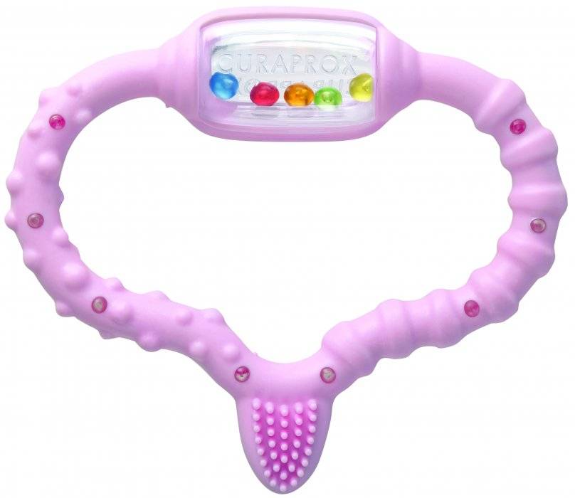 Skvělým dárkem pro miminko může být sada péče o první zoubky Curaprox Baby Gift Set Pink. Biofunkční dudlík v nejmenší velikosti pomůže správnému vývoji čelistí a patra. Kousátko s chrastítkem a gumovým kartáčkem mírní bolest při prořezávání prvních zoubků. K čištění prvních zoubků je výbornou volbou zubní kartáček s velmi jemnými a hustými vlákny.