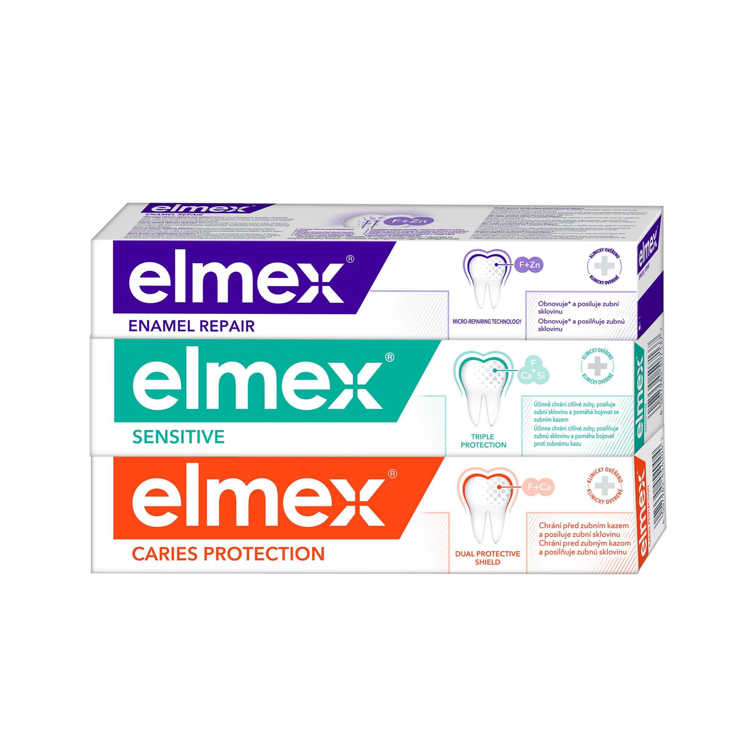 Trojbalení past Elmex Mix nabízí oblíbené pasty od značky Elmex. Caries Protection poskytuje ochranu před zubním kazem a posiluje sklovinu, Enamel Repair pomáhá doplnit vápník a další minerály a Sensitive poskytuje ochranu citlivým zubům. Všechny pasty obsahují 1 450 ppm fluoridů a jsou vhodné pro každodenní použití.