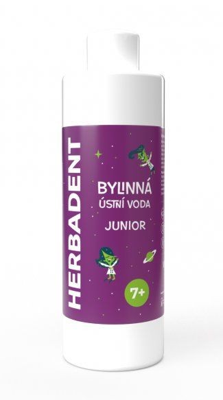 Přírodní ústní voda pro děti od 7 let Herbadent Junior obsahuje výtažky ze sedmi léčivých bylin, které pečují o zoubky i dásně a zklidňují sliznici úst.