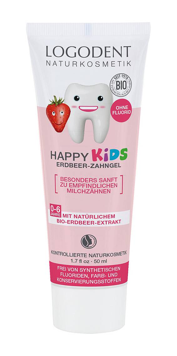 Jemná dětská zubní pasta s jahodovou příchutí Logodent Happy Kids Strawberry je vhodná již od prvního zoubku. Šetrně odstraňuje zubní povlak a obsahuje látky podporující trávení.