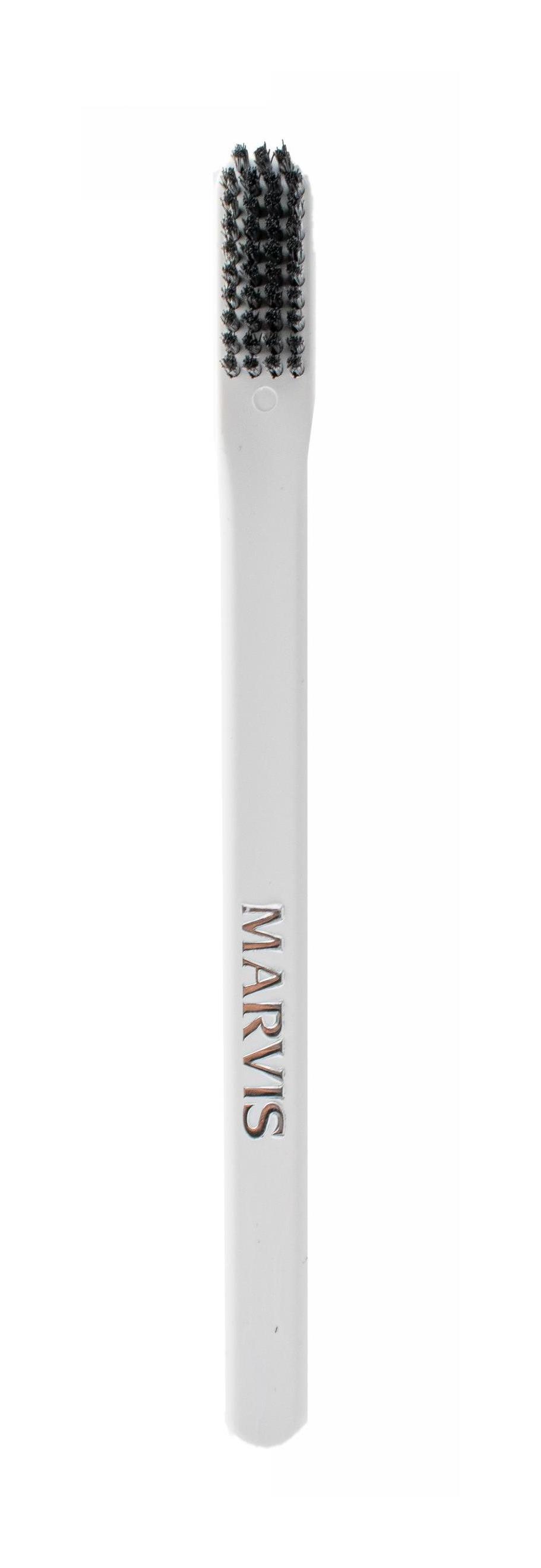 Elegantní bílý kartáček s černými rovně střiženými vlákny Marvis Soft jemně odstraní zubní plak a další nečistoty. V balení dostanete i praktickou krytku na hlavici kartáčku.