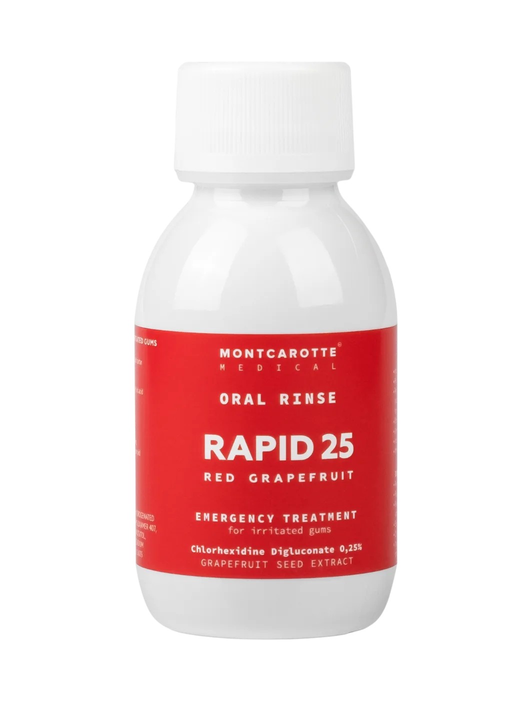 Antibakteriální ústní voda s 0,25% chlorhexidinem Montcarotte Rapid 25 Red Grapefruit podporuje hojení ran po chirurgických zákrocích v ústech, pomáhá při zánětech a krvácení dásní a je vhodná i před a po implantologických zákrocích.