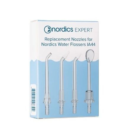 Sada trysek Nordics IA44 obsahuje nástavce pro kažodenní čištění, k čištění kolem zámečků rovnátek, pro parodontální choboty a pro odstranění povlaku z jazyku. Trysky jsou kompatibilní se sprchami Nordics IA44.
