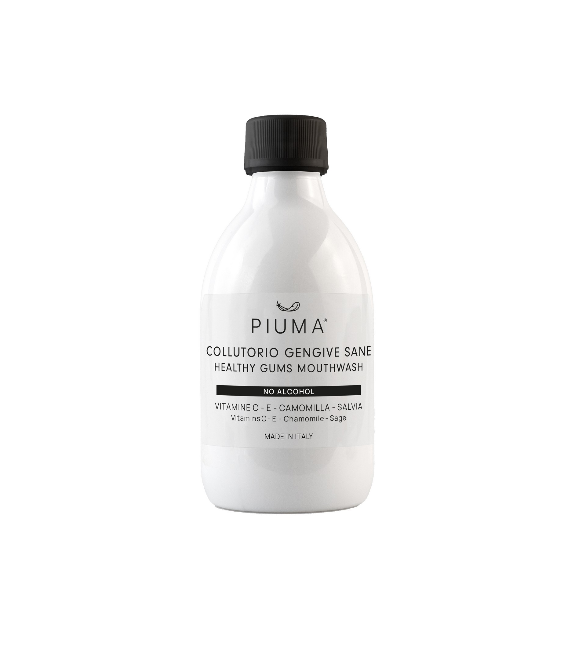 Jemná ústní voda bez alkoholu Piuma Healthy Gums pečuje o citlivé dásně, zklidňuje podráždění a podporuje jejich regeneraci. Výtažky z heřmánku a šalvěje působí protizánětlivě, zatímco vitaminy C a E chrání sliznici díky svému antioxidačnímu účinku.