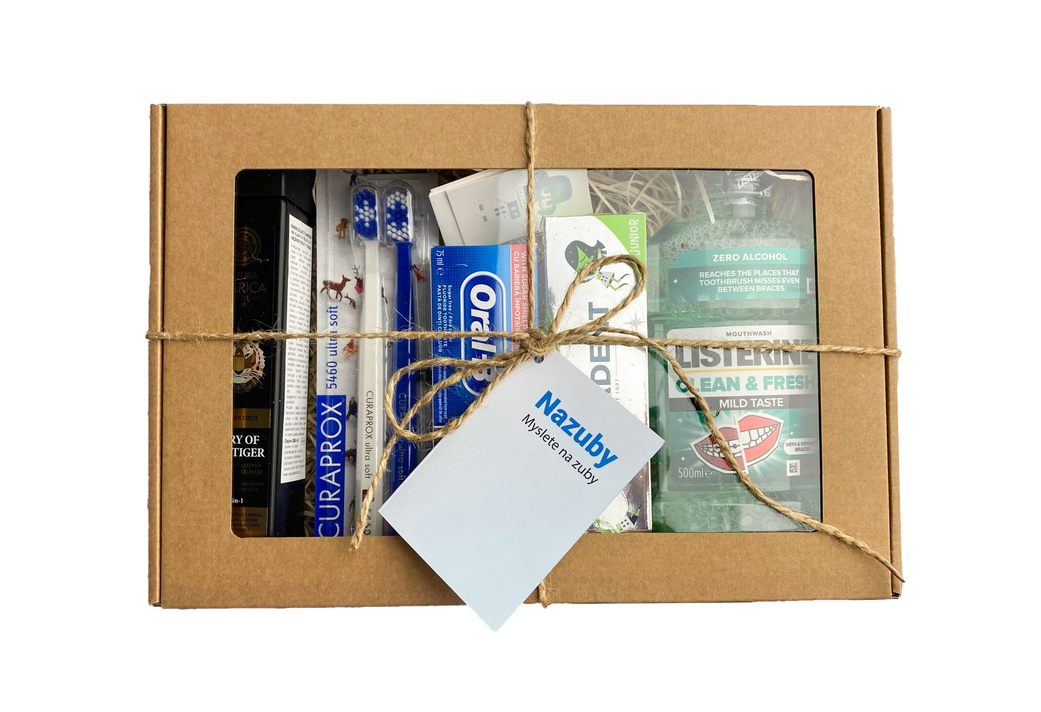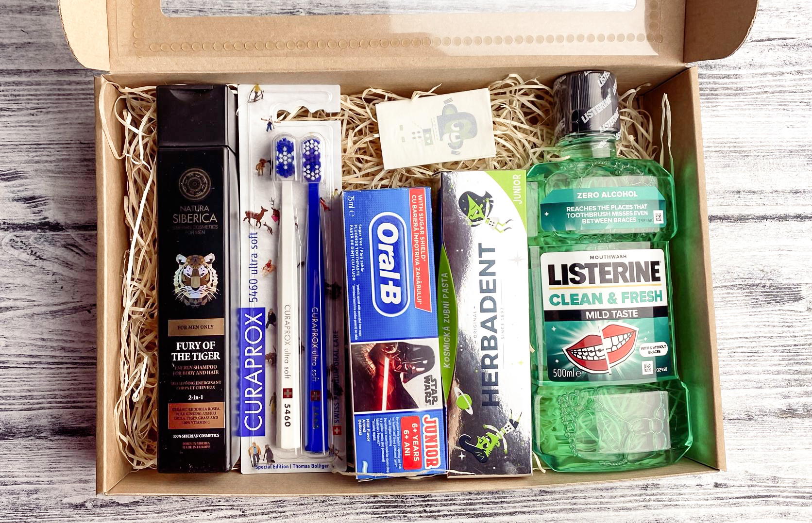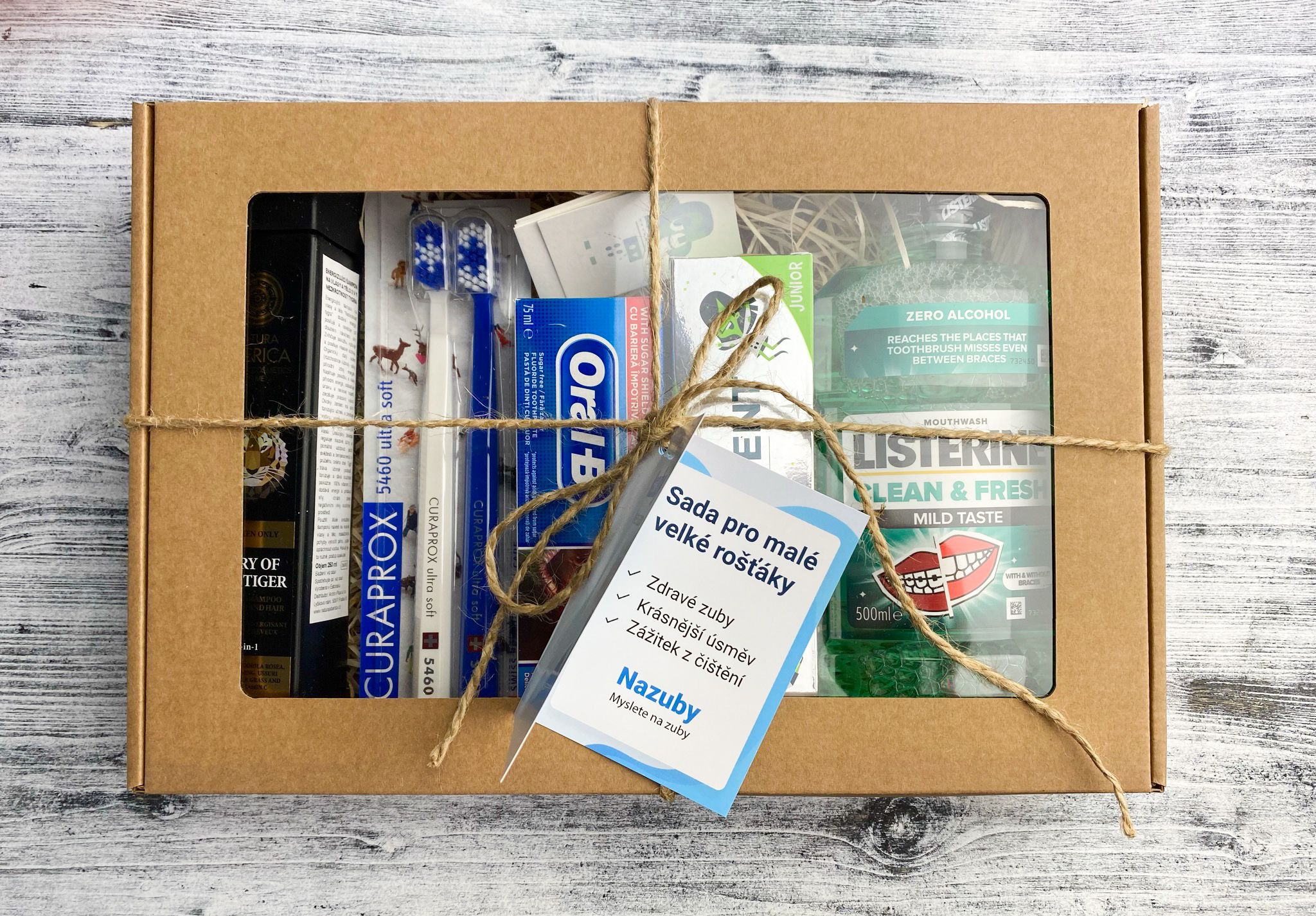 - obsahuje dva kartáčky, dvě pasty, ústní vodu a sprchový gel