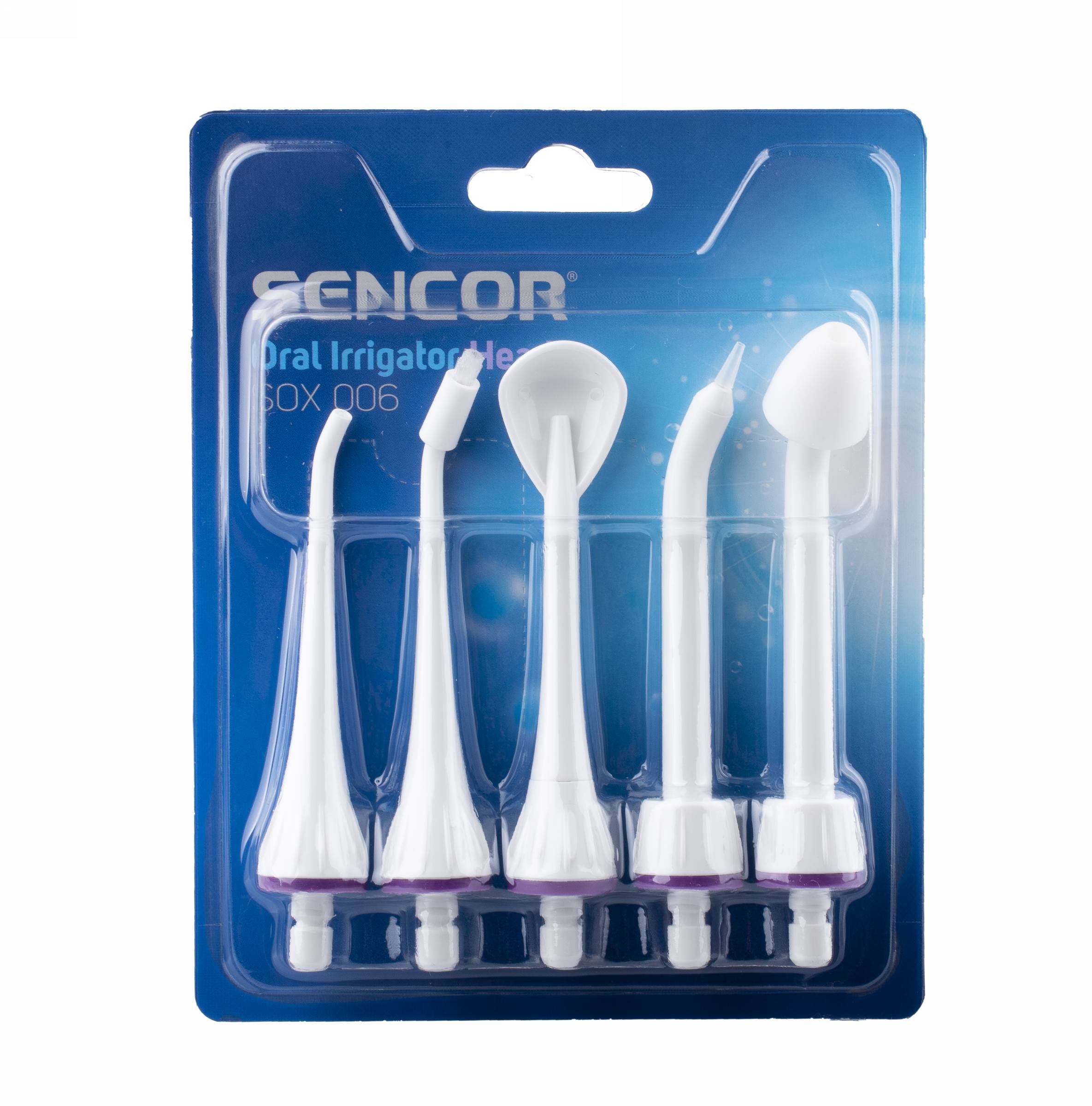 Sencor SOX 005 obsahuje hned pět náhradních trysek pro ústní sprchy Sencor SOI 1x. Standartní nástavec, ortodontický, nástavec pro čištění jazyka, pro čištění prohlubní a k čištění nosní dutiny.