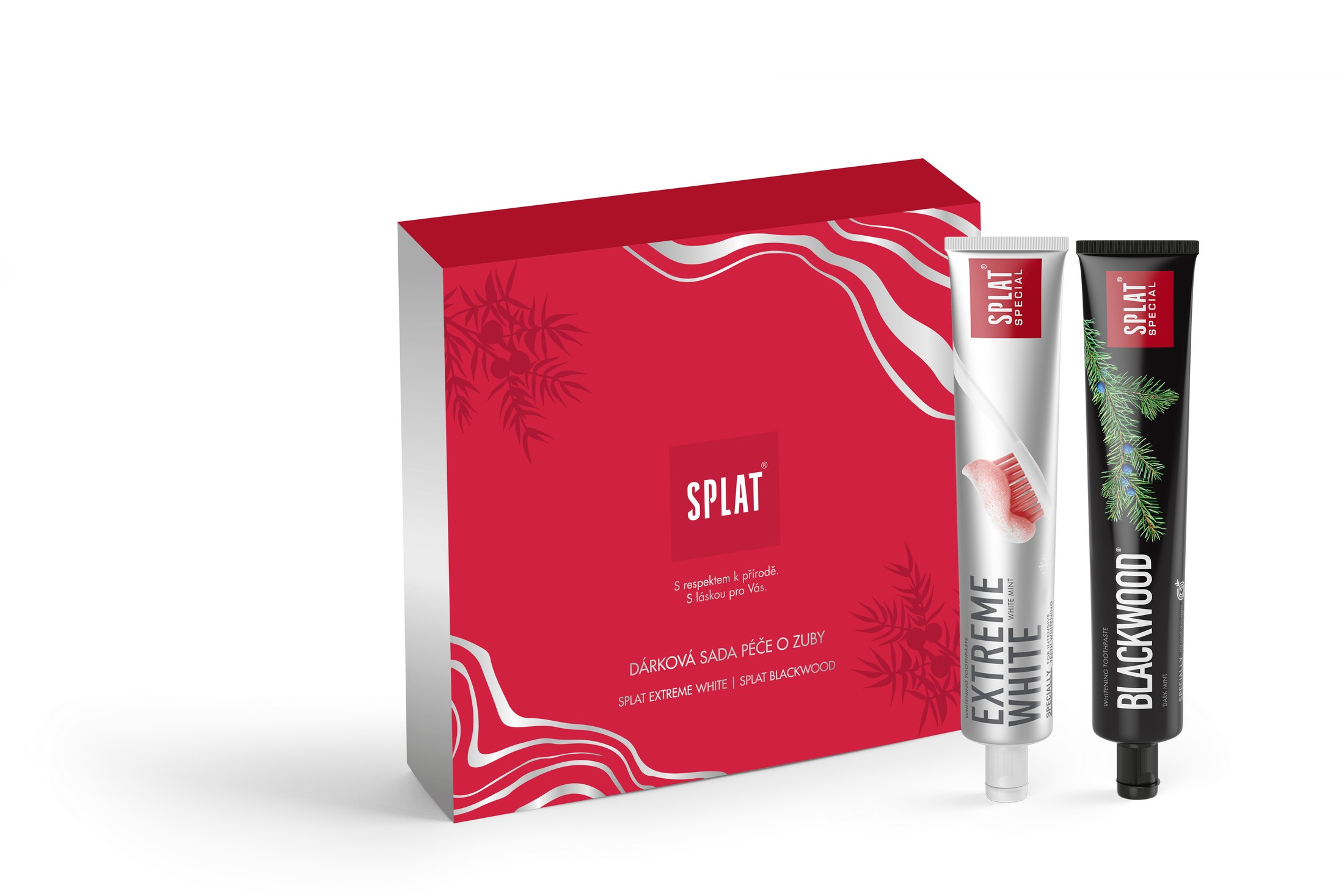 Sada Splat obsahuje přírodní pastu Splat Extreme White s mikrogranulemi karbamid peroxidu a s 600 ppm fluoridů. Pasta Splat Blackwood s aktivním uhlím má příjemnou chuť jalovce. Obě pasty pomáhají odstranit povrchové zabarvení, brání hromadění plaku a jsou bezpečné k zubní sklovině.