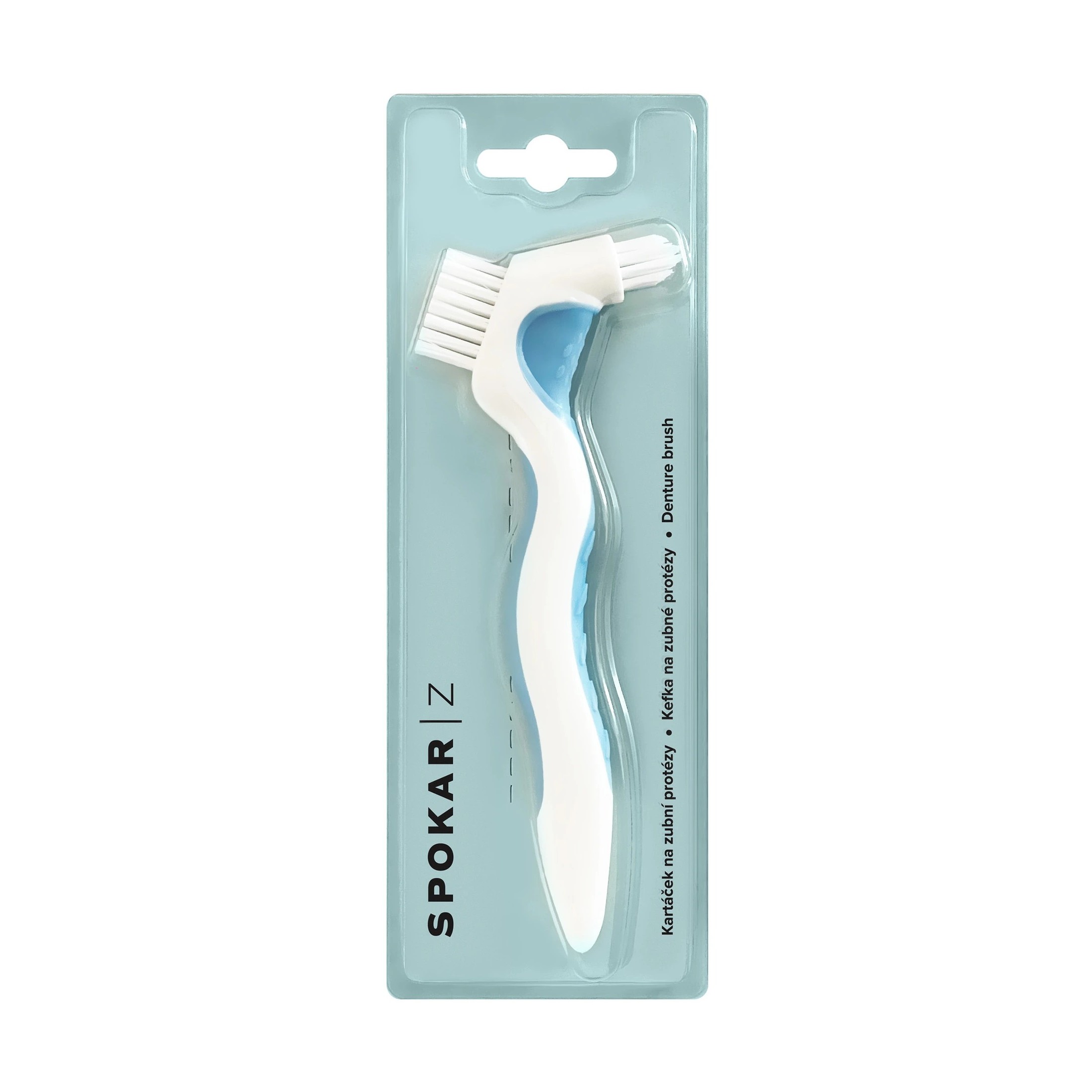 Speciální oboustranný zubní kartáček Spokar Z je ideální pro čištění zubní náhrad. Tuhá vlákna se postarají o důkladné odstranění plaku. Rovná vlákna jsou určena pro vnější plochy, zatímco stranou se zastřiženými vlákny se snadno dostanete do hůře přístupných míst.