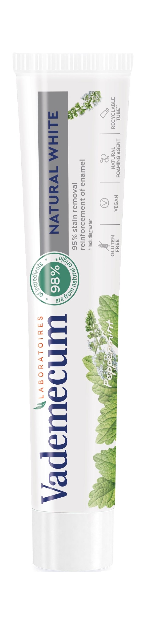 Přírodní zubní pasta Vademecum Natural White Peppermint pomáhá šetrně odstranit povrchové zbarvení zubů. Obsažený fluorid chrání před vznikem zubního kazu.