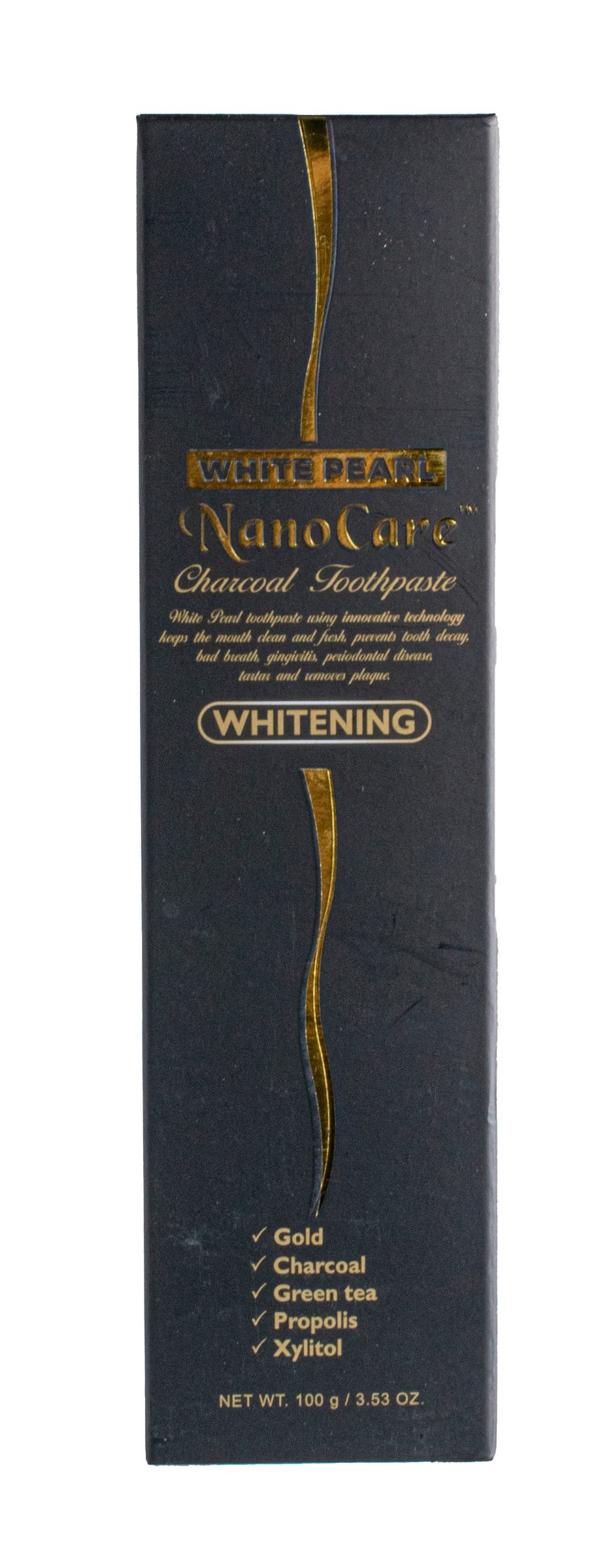 - Sorbitol, Aqua, Hydrated Silica, Sodium Lauryl Sulfate, PEG-32, Mentha Piperita Oil, Charcoal, Xanthan Gum, Menthol, Sodium Benzoate, Sodium Saccharin, Xylitol, Chitosan, Propolis Extract, Camellia Sinensis Leaf Extract, Sodium Monofluorophosphate, Gold